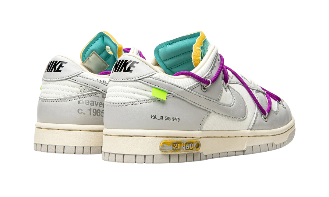La Off-White x Nike Dunk “Lot 21” è una delle cinquanta varianti di colore della scarpa da basket retrò disegnata da Virgil Abloh per un’uscita ad agosto 2021. L’attesa collezione “Lot 50” tra Abloh e Nike segue la collaborazione “The 10” del 2017, una delle collaborazioni di sneaker più influenti della storia. La “Lot 21” è realizzata con una base in tela Sail con sovrapposizioni in pelle Neutral Grey a contrasto e marchio Swoosh. Il dettaglio “Nike” nero si trova sul tallone. Altrove, il testo Helvetica di Off-White appare sul lato mediale. Un sistema di allacciatura secondario, simile a un bungee cord, è posizionato sulla tomaia in viola. Il look è coerente con lo stile della prima collaborazione di Off-White con la Nike Dunk del 2019. Il sistema di allacciatura tradizionale sulla tomaia mantiene il design originale della Dunk. Sotto i piedi, un inserto marmorizzato giallo e grigio “Lot 21 of 50” sull’intersuola. Data di uscita: 9 agosto 2021.