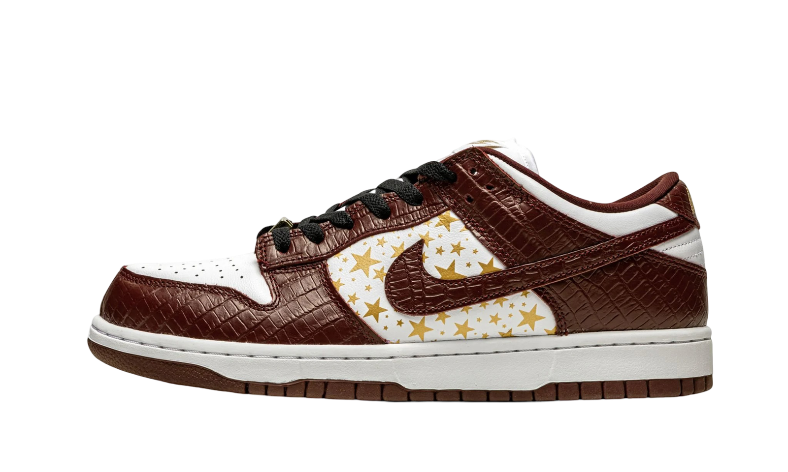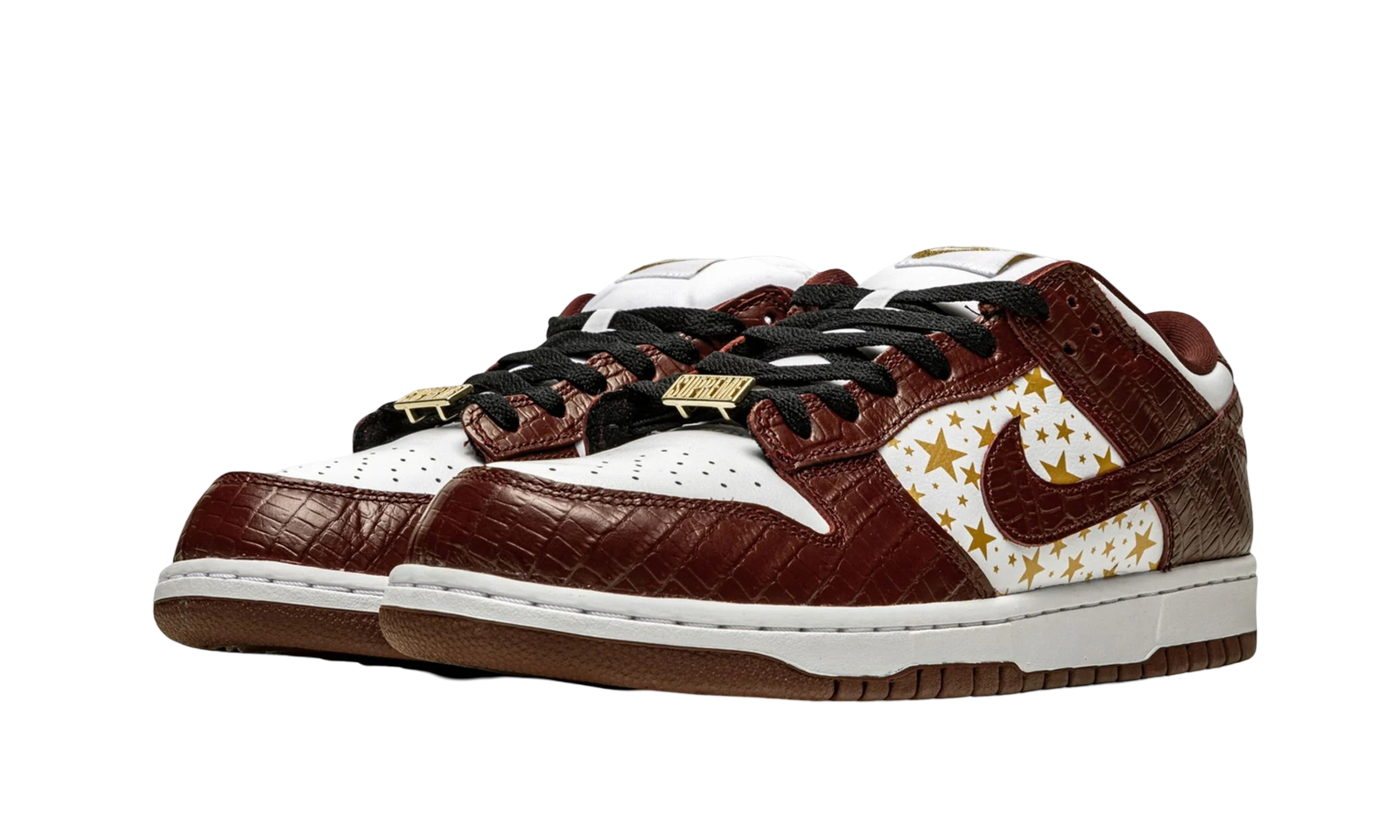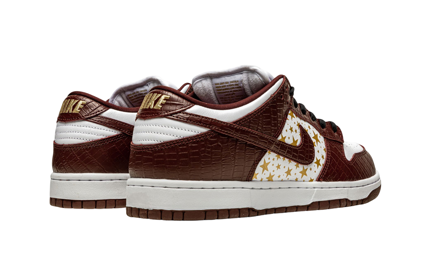 La Supreme x Nike SB Dunk Low “Stars – Barkroot Brown” è una collaborazione tra il marchio di streetwear con sede a New York e Nike SB che dà un tocco premium alla popolare scarpa da skate. Una delle quattro varianti di colore rilasciate a marzo 2021, la “Stars – Barkroot Brown” imita lo stile unico della seconda collaborazione di Supreme e Nike SB del 2003. Come la collezione “OG”, questa versione moderna presenta pannelli in finta pelle di coccodrillo sull’avampiede, sugli occhielli, sul colletto, sul tallone e sullo Swoosh. La base bianca sulla punta traforata, sul pannello centrale e sul collare permette ai pannelli in coccodrillo di attirare l’attenzione. Inoltre, il motivo delle “stelle” in oro metallizzato stampato su entrambi i lati della scarpa ricorda il look della colorazione originale “Stars” disegnata da Supreme. Un emblema Supreme in oro metallizzato si trova sui lacci neri della linguetta in mesh bianco e un logo Nike ricamato in oro è cucito sul retro della scarpa. Data di uscita: 4 marzo 2021.